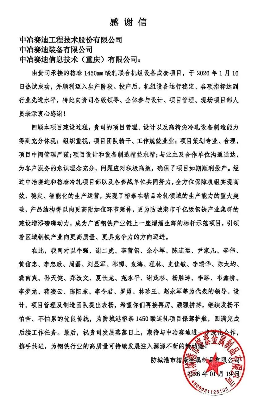 2026年1月19日,中冶赛迪收到来自广西防城港金属制品有限安博电子官方网站的感谢信,对中冶赛迪在榕泰1450mm酸轧联合机组设备成套项目中的卓越表现给予充分肯定,对项目团队的专业素养与敬业精神致以高度赞誉,字里行间满含认可与信赖。