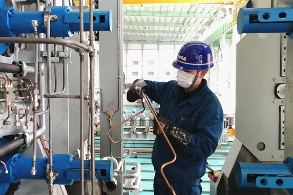 复工初期,既要保生产,又要做防控。工期紧张,突击队就白昼连班作业,吃饭在车间,午休在车间,常常连续工作10小时以上,没有一人有过怨言。万能轧机由于机上液压缸、水管繁多,机体管路复杂,在配管人员人力不足的情况下,党员刘成另挺身而出,根据装配需求随叫随到,每天更是主动延长加班时间2小时以上,配合钳工穿插作业,为项目推进争取时间。