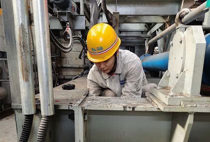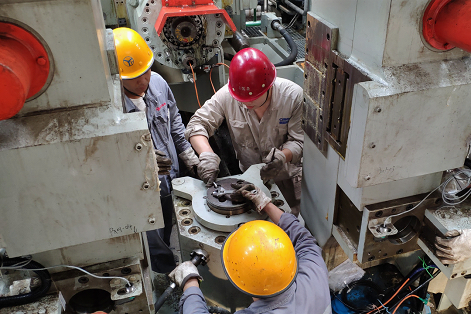 李祥和罗志成是4月就派往现场的,因万能轧机是由7组机架组成,而相邻的两台机架共用一个底座,安装过程的每一步都需要控制好公差范围,稍有不慎,就可能因解决后边发生的问题而影响了前面的调试结果,可谓“牵一发而动全身”。两位师傅凭借多年的工作经验,从容应对,积极配合业主和施工方,解决各类装配问题。有时为了赶工期与施工方一起值守到深夜,第二天为了项目需要又早早抵达项目现场开始新一天的工作。