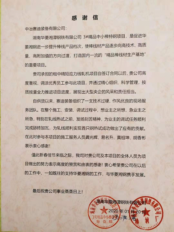 此项目从签订合同以来,赛迪装备积极应对,精心组织,全力配合业主现场生产计划,截止到2019年12月26日,该项目在线和备件共42台套轧机全部运抵现场,陆续安装、调试并一次性热试成功,最终受到业主的好评,并专程发来了感谢信。