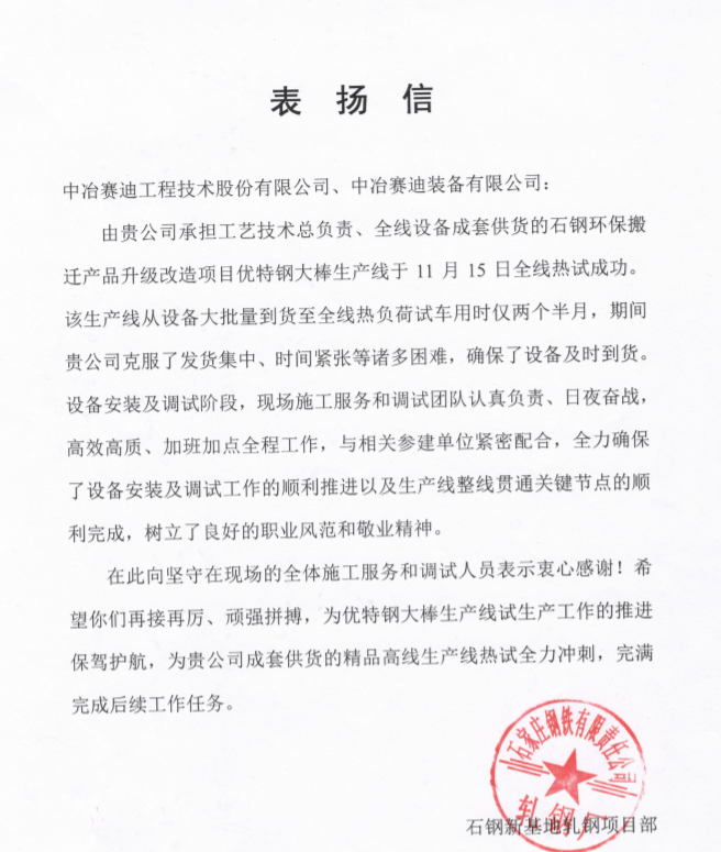 由赛迪股份设计赛迪装备承制的石钢环保搬迁大棒&高线项目于11月15日顺利全线热试成功,石钢高线也于11月30日晚11时顺利热试通过四架粗轧机。
