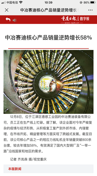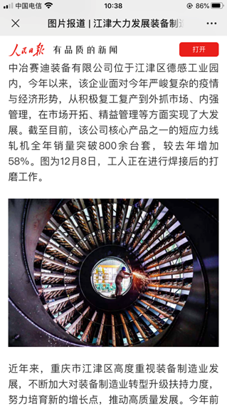 面对安博电子官方网站良好的发展势头,各路媒体纷至沓来,争相报道。重庆卫视新闻联播以《中冶赛迪:技术创新推动数字化转型》为题,着重报道了赛迪装备“产品化”和科技创新成果;人民日报以《江津大力发展装备制造业,助推高质量发展》为题,重点介绍了赛迪装备在精益管理、市场开拓上的重大突破;重庆日报也推出《中冶赛迪核心产品逆势增长58%》的报道,展现赛迪装备在今年复杂形势下实现的跨越式发展。,
