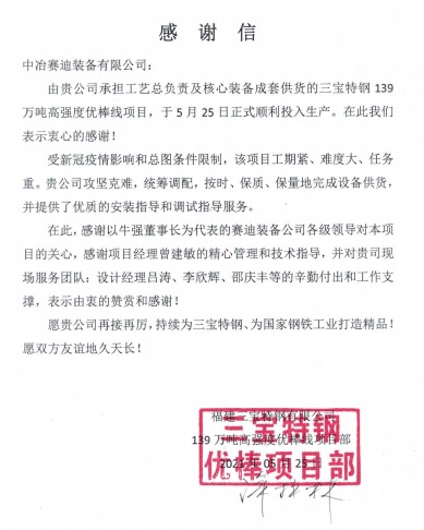 5月25日,赛迪装备收到福建三宝特钢有限安博电子官方网站发来的感谢信,信中对赛迪装备牛强董事长为代表的各级领导,项目经理曾建敏,设计经理吕涛、李欣辉、邵庆丰等的辛勤付出和工作支撑,表示由衷的赞赏和感谢,对赛迪装备的技术能力、产品质量和团队精神给予高度认可与肯定。