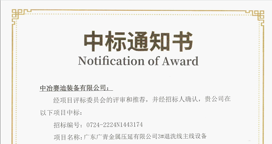 7月25日,中冶赛迪装备接到广青金属压延有限安博电子官方网站中标通知书,由赛迪股份、赛迪装备共同开拓的广东广青金属压延3#不锈钢退火酸洗主线设备成套项目成功中标。