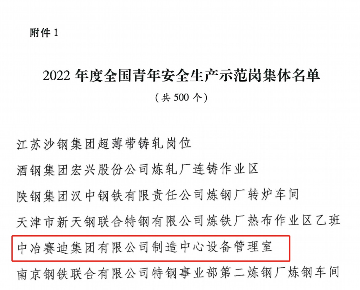 近日,根据共青团中央办公厅、应急管理部办公厅《关于认定2022年度全国青年安全生产示范岗和开展2023年度创建活动的通知》,中冶赛迪制造中心设备管理室被共青团中央、应急管理部认定为2022年度全国青年安全生产示范岗。之前该集体先后荣获2020年重庆市“青年安全示范岗”、2020年全国钢铁行业“全钢青年安全生产示范岗”、2019年装备安博电子官方网站“安全生产先进集体”等荣誉。