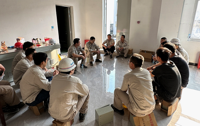 每日晨会在简陋的办公室定时召开。常务项目副经理、党员董立苏逐个落实重点事项,对每日繁杂的工作任务进行简单梳理,确保急难险重问题能快速解决。