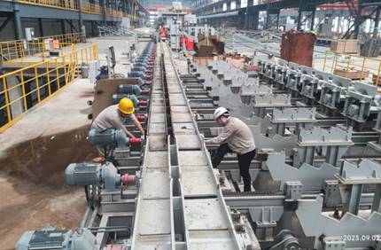 生产线靠前的连轧区域因赛迪装备成熟而丰富的工程经验进展很顺利,各项指标均达到设计要求。然而9月18日临近热试节点时,采用新工艺的编组区与冷床区因小问题叠加,调试时液压缸损坏出现了漏油情况。为了确保20日的热试节点“后墙不倒”,张程霖、周德洪、程江、夏棋、高阳5名设计当天连夜收集现场流体液压参数和应用数据,在没有经验可循的情况下逐个进行分析、验证,加班加点制定出2套备用整改方案。19日,团队10余人拧成一股绳,在临时党支部书记、项目经理赵远峰带领下,党员同志董立苏、张程霖、高阳、张子念、周德洪等人充分发辉先锋模范作用,带头逐一复核尺寸、校对液压参数,期间累了,就和着纸板铺地上简单休息一下,午餐晚餐也是匆匆扒几口盒饭继续投入战斗。最终在“早八对早八“的通宵达旦拼抢下,编组与冷床区具备了热试条件,于20日晚一次性热负荷试车成功。