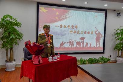 在专题党课开始前,全体党员观看了中印边境自卫反击战网络视频,党委组织部副部长张昆对老英雄的事迹进行了简要介绍,张甲刚代表党政向老英雄送花,并致欢迎词。