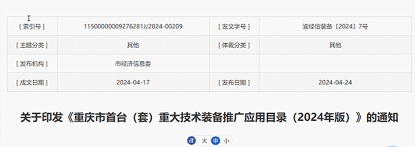 2024年4月24日,重庆市经济和信息化委员会公布《重庆市首台(套)重大技术装备推广应用目录(2024年版)》,由中冶赛迪装备组织申报的中冶赛迪CHSCD型钢矫直机、钢带表面氧化铁皮无酸清理设备两项产品成功入选。