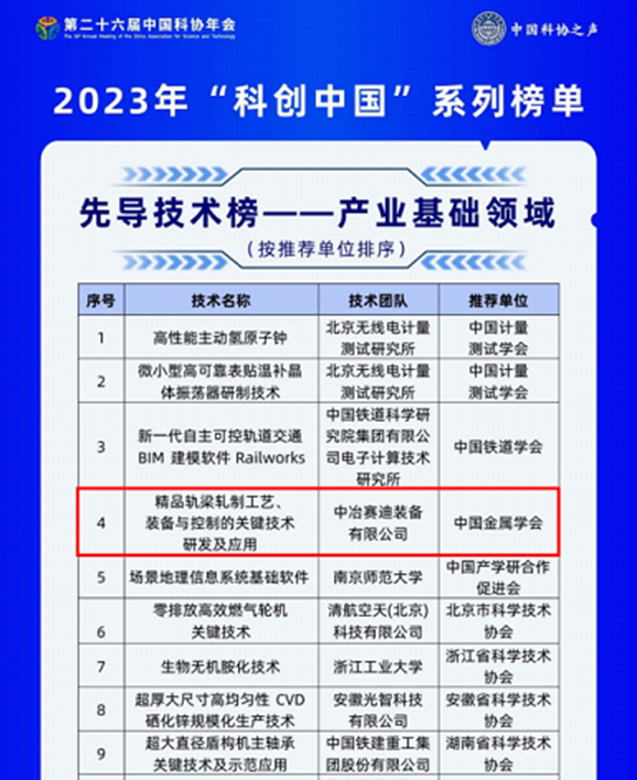 7月2日,中国科学技术协会正式发布2023年“科创中国”系列榜单,中冶赛迪“精品轨梁轧制工艺装备与控制关键技术”上榜产业基础领域先导技术榜单。