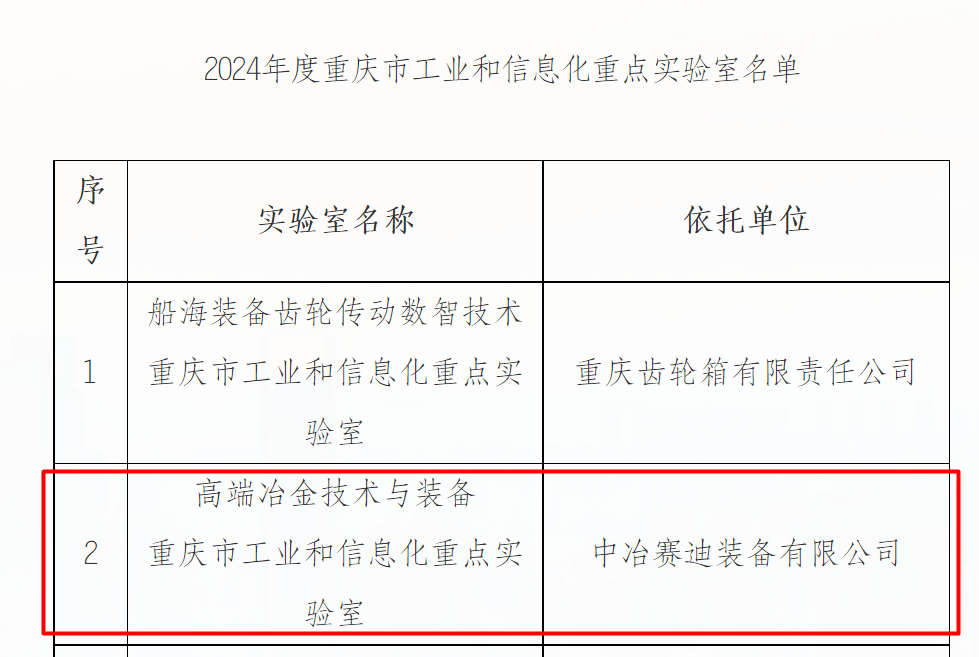 2024年9月19日,重庆市经济和信息化委员会认定中冶赛迪装备建设的“高端冶金技术与装备”实验室为2024年度重庆市工业和信息化重点实验室。