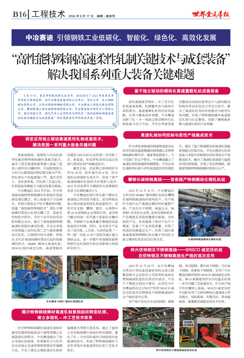 《世界金属导报》专版报道中冶赛迪“高性能特殊钢高速柔性轧制关键技术与成套装备”