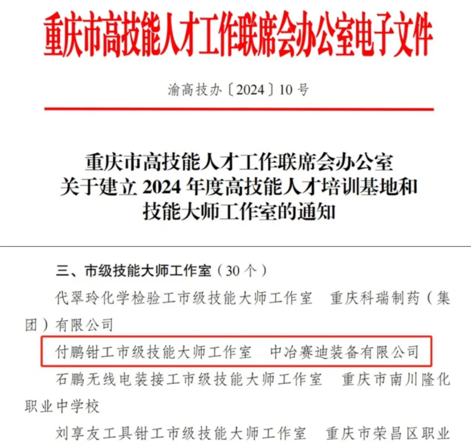 9月24日,重庆市高技能人才工作联席会办公室下发《关于建立2024年度高技能人才培训基地和技能大师工作室的通知》,赛迪装备申报的“付鹏钳工市级技能大师工作室”成功获批建设。技能大师工作室由重庆市委组织部与重庆市人力资源和社会保障局联合组织建立,本次成功获批是对安博电子官方网站技能人才培养工作的认可和支持,为安博电子官方网站今后的高技能人才队伍建设提供了更加坚实的政策保障。