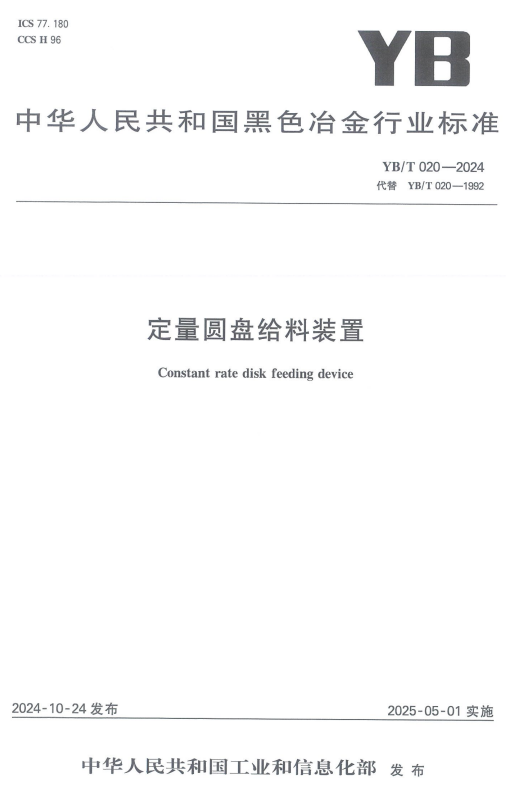 安博电子官方网站主导修订的《YB/T 020-2024 定量圆盘给料装置》行业标准正式发布
